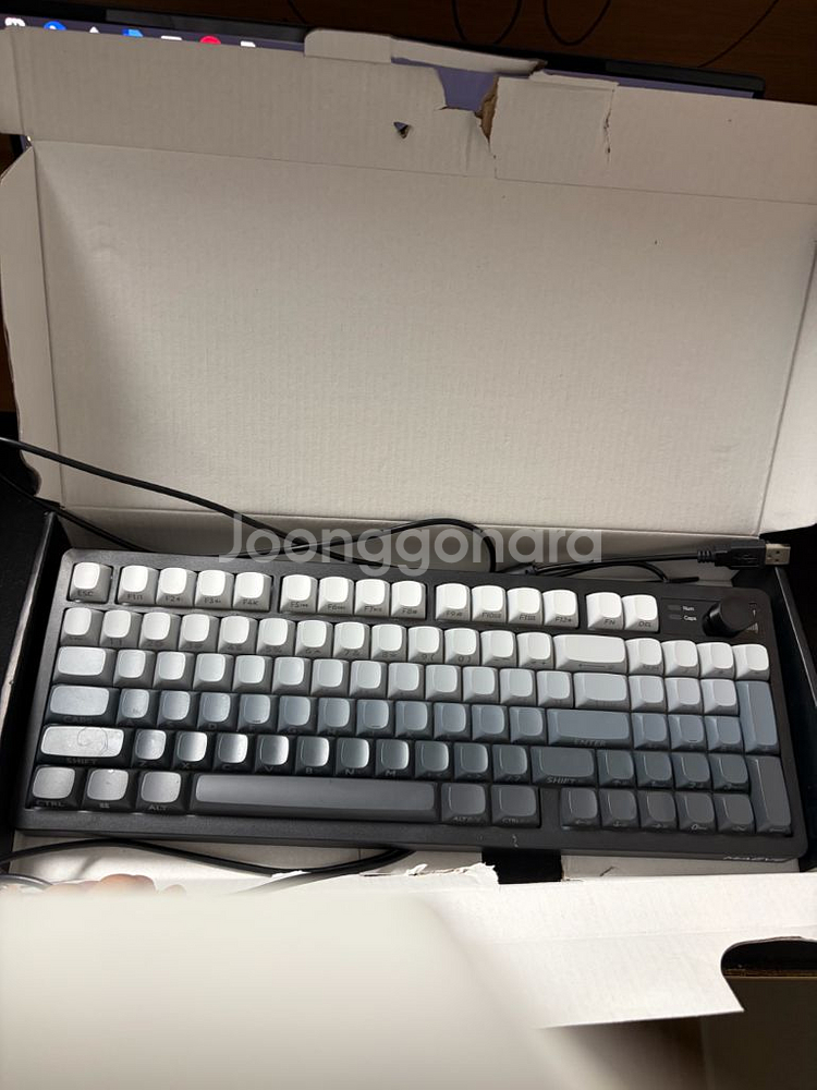 그라데이션 키캡이 장착된 기계식 키보드입니다. 키캡 색깔이 흰색에서 회색으로 은은하게 바뀌는 게 특징입니다. 사진에서 보시는 것처럼 박스에 잘 포장되어 있습니다. 별도 문의 없으시면 바로 안전결제 부탁드려요!