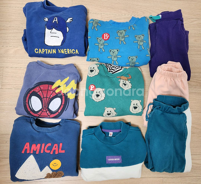 기모 상하복 9벌 일괄 첫줄 110사이즈 둘째셋째줄 120사이즈 베베드피노 1벌 래핑차일드 5벌 밀리밤 1벌 그외 2벌 다 비슷한 시기에 입혔어요. 5살 정도까지는 넉넉히 입힐것 같아요. 사용감 있지만 특별한 얼룩, 하자는 안보여요.