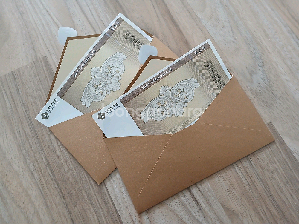 롯데백화점 상품권 5만원권 2매 팝니다. 사진 찍고 밀봉하여 선물 가능합니다. 모두 97,000원입니다. 서울시 노원구 상계동 청원고등학교 후문 마을버스 정류장에서 직거래 원합니다. 노원 롯데백화점 앞에서 거래 가능합니다. 에눌, 네고 사양합니다.