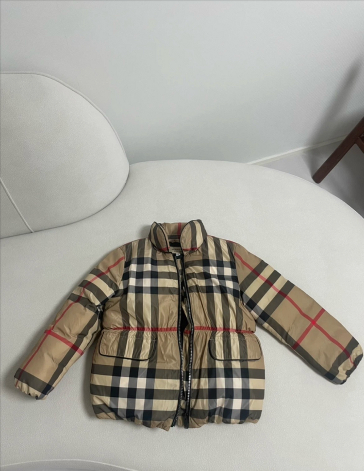 확대버버리 아동용 남여공용 패딩 점퍼예요. 클래식한 체크 패턴과 보온성 좋은구스 충전재로 되어있고, 전체적으로 깔끔한 상태입니다. 가죽 까짐없고, 새제품에 가까워요 택포로 판매해요