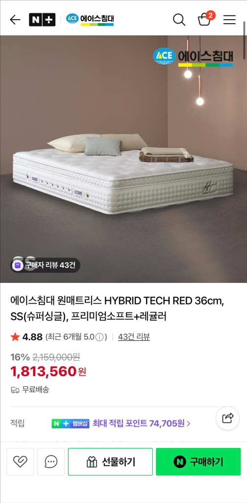- 상품명 : 에이스 침대 - 하이브리드 테크 레드 슈퍼싱글(SS) 새상품 (Hybrid Tech - Red, HT-R) - 구매시기 : 2026년 3월28일 신세계백화점 - 사용기한 : 사용감 없음(새상품). - 가격 : 120만원 2026년 4월 2일 슈퍼싱글 2개 배송받았습니다. 사정이 생겨 1개 급처분합니다. (사용감 없음) 새상품이라 생각하시면 됩니다. 현재 사용하지 않고 보관중입니다.(품질보증서 있음) 근처 백화점가시면 베스트셀러 제품이라 마음껏 체험해 보실 수 있습니다! 배송은 먼 경우 용달하거나 협의하면 좋을 것 같습니다!