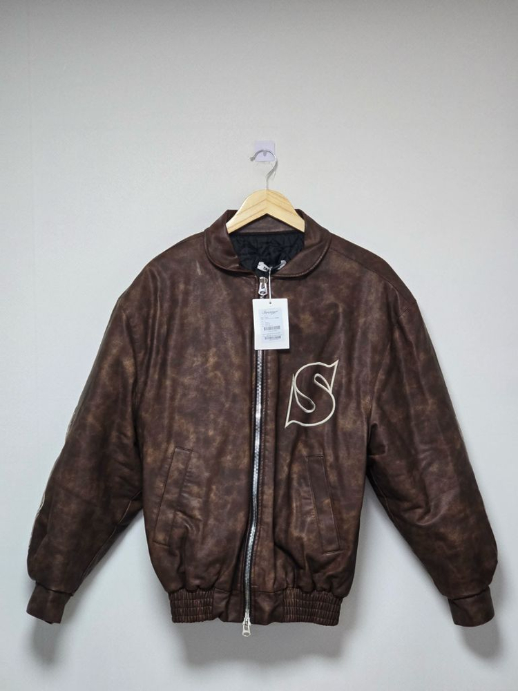 브랜드 로고가 새겨진 가죽 봄버 자켓이에요. 태그가 달려있는 새 제품 상태로 보이며, 클래식한 디자인이 매력적입니다. 스트레인저 바이커 자켓 전체적으로 상태는 양호합니다 가슴 부분에 S 로고가 디자인되어 있습니다 라벨 택까지 살아있는 완전 새상품입니다 현재는 판매되고있지않는 모델이라 희구성이 돋보이는 제품입니다 사이즈는 M이지만 F사이즈처럼 100-105까지 소화 가능합니다