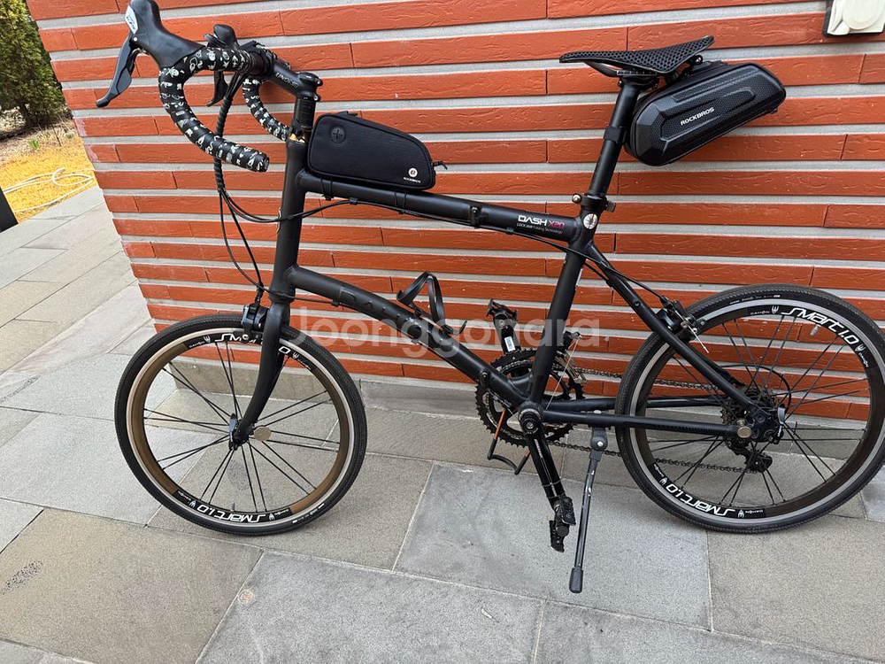 다혼 대쉬 x20 모델입니다 타이어 맥시스토치로 교환했고요 와이어 전부 새걸로 교환했습니다 구동계 올 시마노105이고요 패달도 mks 좋은거 달려 있습니다 접는 부위 기스 있고요 나머지는 큰 기스 없습니다 지역은 경남 진주에요 가방 안장은 빼고 드립니다