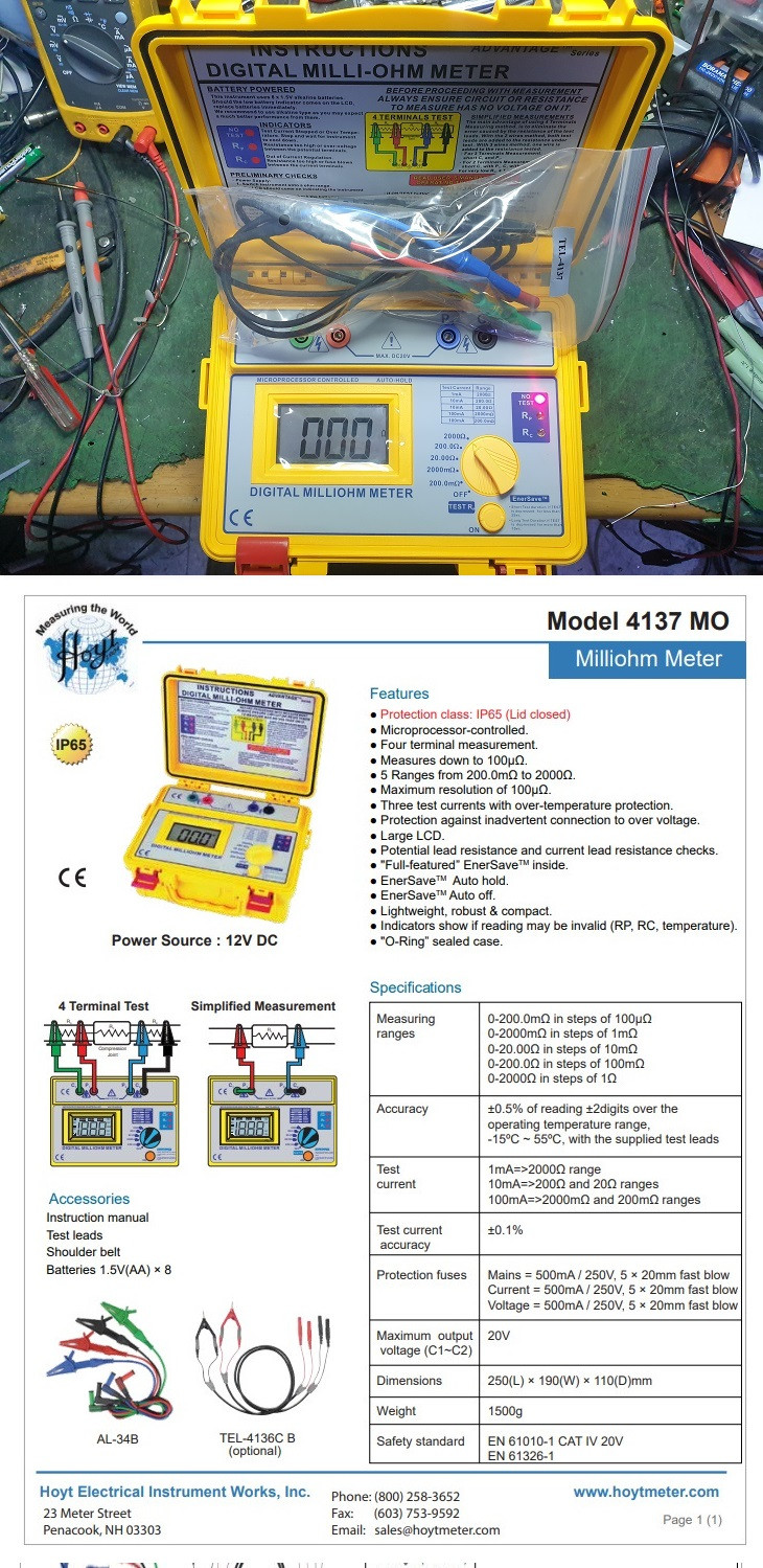 품명: Digital Millohm Meter 모델: 4137 Digital Millohm Meter 수량: 1대 가격: 350,000원 담당:010-9135-2888 임연원 지역:인천광역시 동구 방축로 37번길 30 (송현동,인천산업용품상가 8동306호) Specifications Measuring ranges: - 0-200mΩ in steps of 100μΩ - 0-2000mΩ in steps of 1mΩ - 0-20Ω in steps of 10mΩ - 0-200Ω in steps of 100mΩ - 0-2000Ω in steps of 1Ω Accuracy: ±0.5% of reading ±2 digits over the operating temperature range (-15ºC~+55ºC, with the supplied test leads.) Test current: - 1mA=>2000Ω range - 10mA=>200 / 20Ω ranges - 100mA=>2000m / 200mΩ ranges Test current accuracy: ±0.1%. Protection fuses: - Mains = 0.5A, HBC, 5 × 20mm, DIN - Current = 0.5A, HBC, 5 × 20mm, DIN - Voltage = 0.5A, HBC, 5 × 20mm, DIN Maximum output voltage(C1~C2): 20V. Dimensions: 250(L) × 190(W) × 110(D)mm. Weight: 1500g. Power Source : 12V DC, 1.5V(AA) × 8. Safety Standard: EN 61010-1 CAT IV 20V. EN 61326-1. Accessories: Instruction manual, Test leads, Shoulder belt.