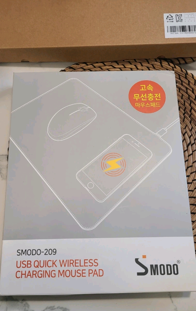 SMODO-209 USB 고속 무선충전 마우스패드 새제품입니다 박스에 담겨있는 미사용 제품이에요 마우스패드와 무선충전 기능이 결합되어 있어 편리하게 사용할 수 있습니다 9V 충전으로 더 빠르게 충전할 수 있고, 고급스러운 가죽 패턴 디자인으로 데스크탑을 깔끔하게 정리할 수 있어요 출력은 5W, 10W, 9V, 1.1A를 지원합니다