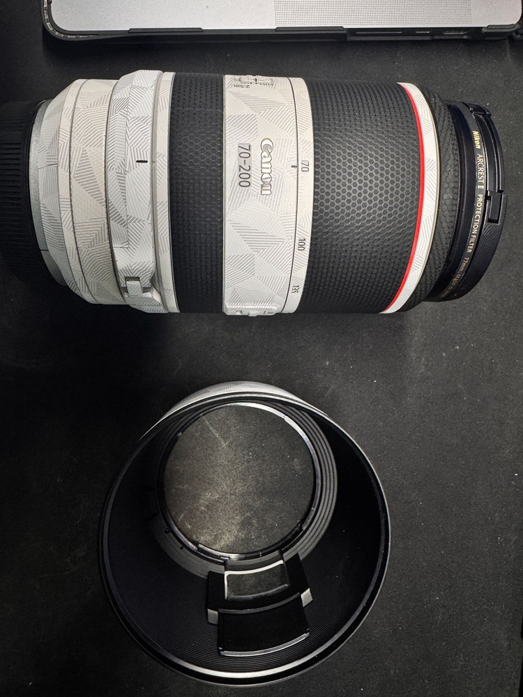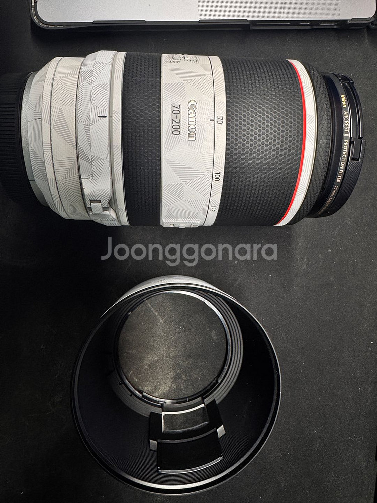 개인정보(거래정보)를 주고받는 행위는 사기에 노출될 수 있으므로 즉시 중고나라로 신고해 주세요캐논 RF 70-200mm F2.8 렌즈입니다. 후드 및 박스구성품 포함, 스킨 붙여놔서 전체적으로 깔끔한 상태입니다. 켄코 셀레스테 필터 포함입니다. 보증 2027-03-19까지.