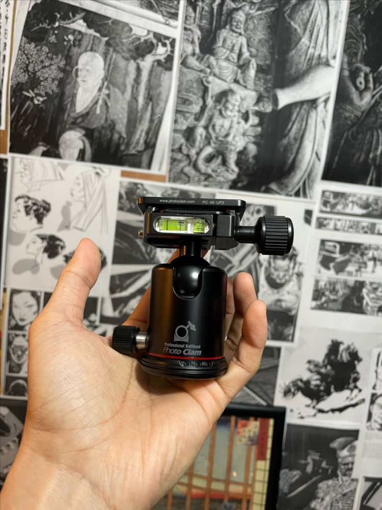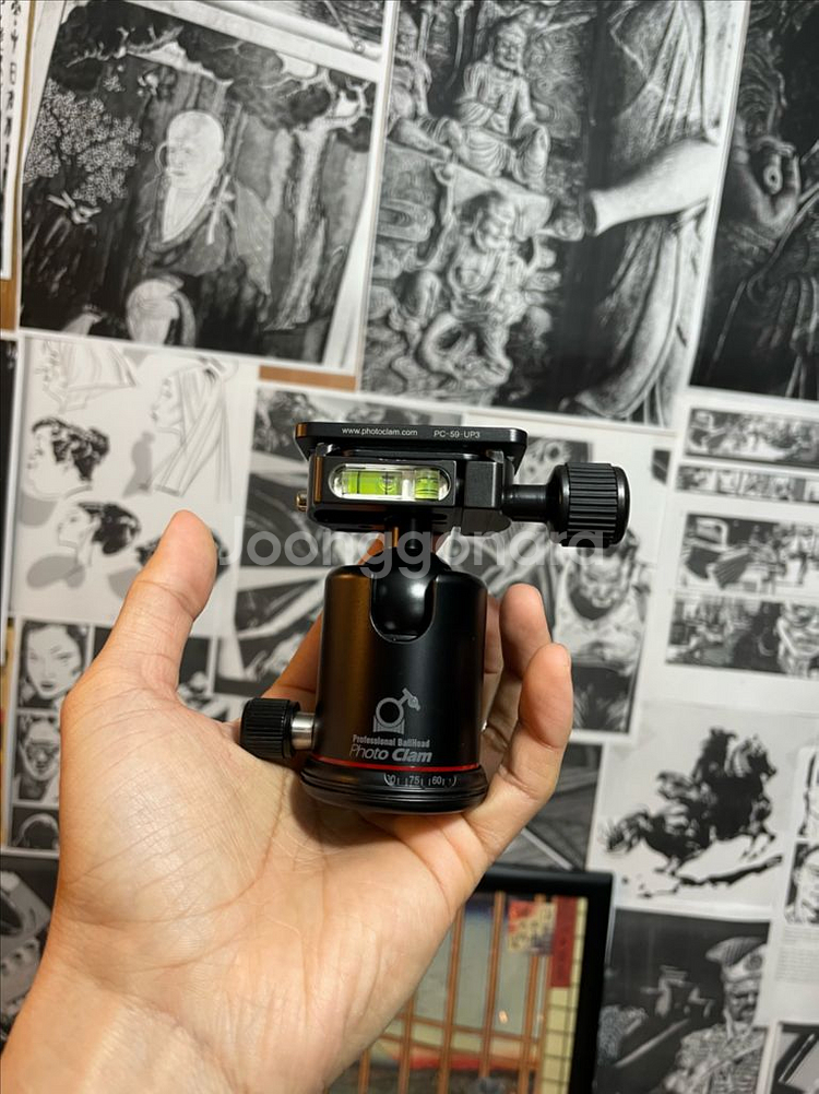 포토클램 PC-33 볼헤드와 PC-59-UP3 플레이트입니다. 미약한 사용감 이외에는 기능에 문제 없을 뿐더러 매우 깨끗한 컨디션입니다.볼헤드는 작은 크기임에도 탑재중량이 30kg이며 플레이트도 작은 크기지만 포토클램 특유의 얇으면서도 견고한 만듦새가 있습니다. 612판형의 중형 필름바디를 올려두고 사용하였지만 결과물이 흔들리거나 거치가 불안했던 적은 한 번도 없습니다. 경박단소하면서도 신뢰할 수 있는 구성을 원하시는 분께 추천 드립니다.