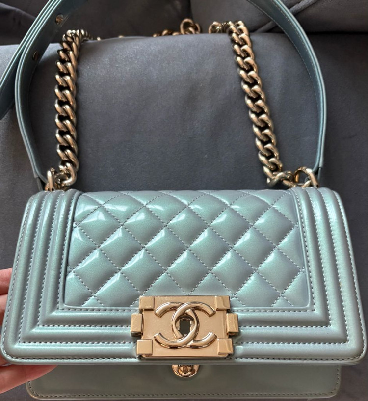 샤넬 보이백 스몰 페이던트 금장 샴페인컬러 박스 개런티카드 쇼핑백 모서리 부분 사진처럼 이염 조금 있고 스크래치 아주 자세히보면 있어요 그외에 까임은 없구요 색상이 유니크하고 컬러가 사진엔 잘 안담기지만 아주 살짝 에나멜? 진주 펄? 같은… 빛을 어떻게 비추냐에 따라 살짝씩그렇게 비쳐보이는듯하는데.. 색상자체는 차분하지만 흔하지않은 컬러라 고급스러워요