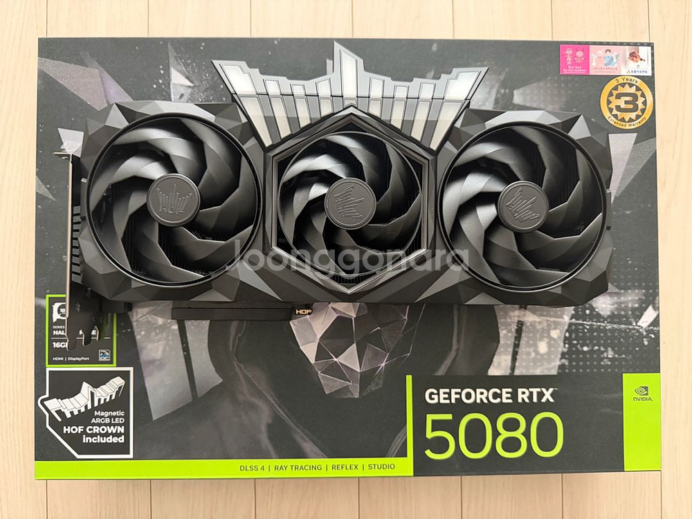 [S급/영수증포함] 갤럭시 RTX 5080 HOF 블랙 (26년 3월 9일 구매) 판매합니다. 1. 제품명: 갤럭시 GALAX GeForce RTX 5080 HOF (Hall Of Fame) 블랙 2. 구매 시기: 2026년 3월 9일 (신품 구매) 2026년 3월 23일 초기불량으로 새제품 교환하였습니다. 3. 사용 기간: 약 2주 / 현재 본체에서 탈거하여 박스보관중 4. 구성품: 풀박스 (그래픽카드 본체, HOF 전용 액세서리, 박스, 구매 영수증 포함) 5. 희망 가격: 205만원 (직거래 금액기준 판매자 수수료 제외금액으로 안전결제시에는 판매자 수수료 추가부담하시면 됩니다) [제품 상태 및 특징] • 신품급 컨디션: 2026년 3월 초에 구매한후 초기불량건으로 3월 23일 새제품으로 교환한 제품으로 실사용 기간이 매우 짧습니다. 외관에 기스나 먼지 거의 없는 S급 상태입니다. • 보증 기간 넉넉: 국내 정식 유통 제품으로, 갤럭시코리아를 통해 2029년 3월까지 무상 AS가 가능하여 안심하고 사용하실 수 있습니다. (구매 영수증 동봉) • 최상위 수율: HOF(호프) 라인업답게 압도적인 전원부와 쿨링 성능을 자랑합니다. 코어 +250, 메모리 +3000 오버시 부스트클럭 3150 이상 안정적 유지 • 블랙 감성: HOF 특유의 왕관 디자인과 묵직한 블랙 컬러 조합으로 화이트와는 또 다른 고급스러운 시스템 빌드가 가능합니다. [거래 방식] • 직거래: 인천에서 가능합니다. (고가 부품인 만큼 직거래를 선호합니다.) [기타] 개인적인 시스템 업그레이드로 인해 아쉽게 내놓습니다. 코일 노이즈나 온도 모두 양호한 양품입니다. 매너 있는 거래 원하며, 관심 있으신 분은 채팅 연락 부탁드립니다!