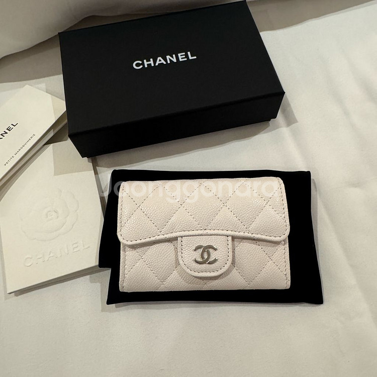 개인정보(거래정보)를 주고받는 행위는 사기에 노출될 수 있으므로 즉시 중고나라로 신고해 주세요샤넬 클래식 카드지갑 화이트 은장 내장칩 풀세트 새상품이에요!! 구성품 : 쇼핑백,박스,더스트,북렛,리본,인보이스(개인정보제외)