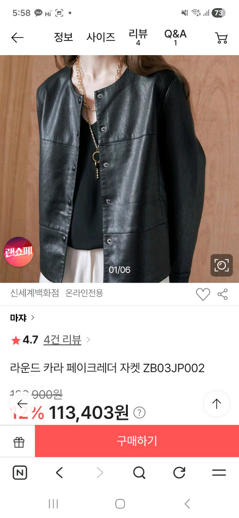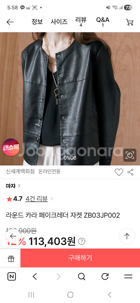 확대MAXZA의 라운드넥 페이크 레더 자켓입니다 실착적어 상태좋아요 사이즈는 FREE이며, 색상은 블랙입니다 실측 사이즈는 다음과 같습니다 - 어깨너비: 43cm - 기장: 55cm - 화장: 57cm - 총장: 60cm