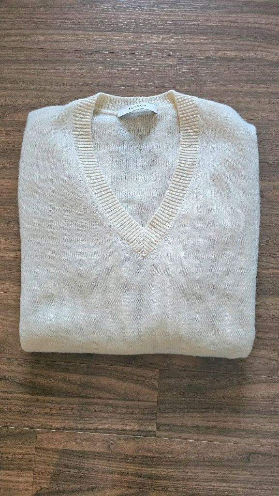 부드러운 캐시미어 100% 소재로 제작된 소윰 SOYOOM 아이보리 브이넥 니트예요 사진에서 보이는 것처럼 깔끔하고 고급스러운 기본 디자인입니다. 어떤 하의와도 잘 어울려서 데일리로 입기 좋아요 20만원 후반대 구입했고 15만원대에 내 놓아요.