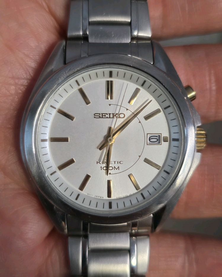 세이코 키네틱오토 (SKA525P1) 화이트 스틸시계 움직임을 감지하여 동력을 얻어서 충전해서 움직이는 키네틱릴레이 시스템의 특별한 시계입니다. 사진과 같이 외관 깨끗하고 작동 잘하며 추가 스트랩 1마듸 있는 양호한 시계입니다 # 시계 단품으로 저렴하게 판매합니다. > Maid in Japan > 스테인레스 스틸 케이스 > 모델 SKA525P1 > 하드락 크리스탈 유리 > 방수 100M 10ATM > 키네틱오토 날짜. 요일표식 > 케이스 직경 :40 mm > 케이스 두께 :10 mm > 20mm 스테인레스 스트랩 》택배 일반+4.5천원, 반값+2.5천원 추가입금(미입금 착불배송) 》저렴한 상품으로 교환, 환불 불가하며, 예민한분은 구매자제 바랍니다. # 팔로우 하신분 ♤Thanks!!