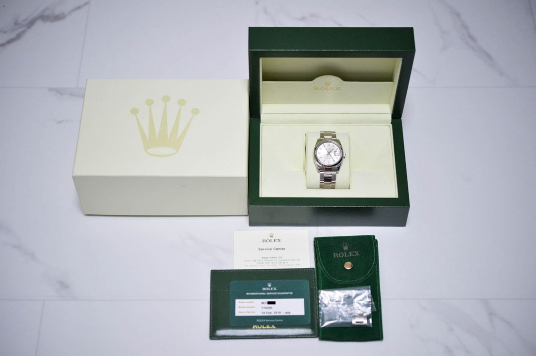 롤렉스 115200 OP 데이트 (실버 다이얼) 용두제외 34mm 사이즈에 지금은 단종된 모델입니다. 인그레이빙 들어간 M단위(2009년식) 제품이고, 박스셋에서 최초 보증서는 분실하였지만 2019년 정식 cs에서 오버홀한 보증서를 보관하고 있습니다. (당연히 보증서상 시리얼 번호와 인그레이빙된 시리얼 번호는 일치합니다.) 오버홀 된지는 시간이 조금 지났지만 아직까지 오차나 파워리저브 등 작동상태 양호하고 문제 있는 부분 전혀 없습니다. 외관 상태는 실착용 하던 시계라 잔기스 정도는 있지만 찍힘이나 보기 흉한 곳 없이 깨끗한 편입니다. 구성품은 박스, 정식cs 오버홀 보증서, 파우치, 여분코 1코가 포함됩니다. (현재 미세 조정 중간으로 놓고 손목 17cm에 착용하고 있으니까, 1코 연장하면 18cm까지도 가능할 겁니다.) 판매가 안되면 알아서 가격 조정할 예정이니까 네고 문의는 사절합니다. 직거래로만 판매하며 직거래는 서울 2호선 을지로3가역 12번출구 5분 거리에 있는 저희 사무실에서 가능합니다. (혹시 카드결제 하실 분은 안전결제 수수료 부담하시면 직거래로 만나서 안전결제 진행도 가능합니다.) 구매의사 있으신 분들은 채팅 주세요. 감사합니다.