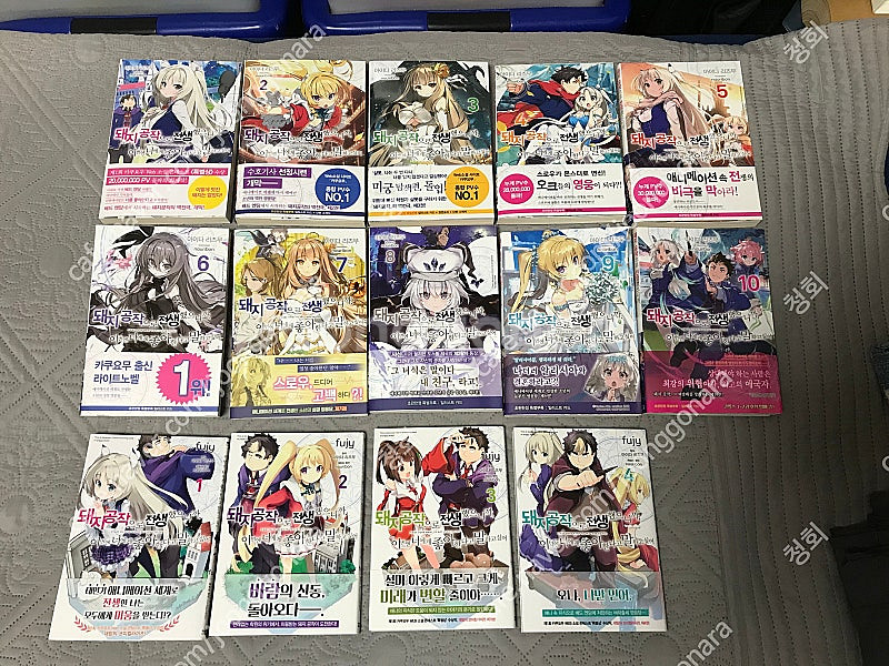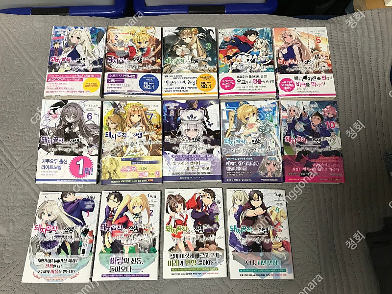 라노벨 라이트 노벨 소설 돼지 공작으로 전생했으니까 이번엔 너에게 좋아한다고 말하고 싶어 1~10권 완결, 만화책 코믹스 1~4권 - 총 14권 전권 올초판 초판 판매합니다. 전권 초판이며, 직접 새 책 구매 후 비닐만 뜯고 읽지 않고 상자에 보관만 했습니다. 초판 특전 띠지, 일러스트 카드, 1~3권 리플릿 모두 그대로 있습니다. 참고로 코믹스 초판 특전은 원래부터 띠지뿐입니다. 다만 구매 후 만지지 않고 보관만 하다 보니 미쳐 알아채지 못한 하자가 몇 있습니다. 먼저 3권 삽화 페이지 중 1장이 파본 인쇄 오류입니다. 사진과 같이 상단 일부분 인쇄가 잘못되어 있고, 저 부분이 훼손되어 있는 파본입니다. 아직 yes24 등의 서점에서 3권 초판을 판매 중이지만, 구매 당시에는 하자를 눈치채지 못해 교환받지 못했고, 현재는 관심이 떨어져서 재구매를 하지 않았습니다. 그 외에는 10권 띠지로 가려져서 몰랐던 책 하단 모서리가 눌린 자국과 책 상단 모서리가 살짝 찌그러진 부분, 9권 겉표지 책등 부분 찌그러진 흔적, 6권 뒷표지에 찍힌 자국 등의 하자가 있습니다. 사진 참고 부탁드립니다. 택비는 별도 6천원입니다.