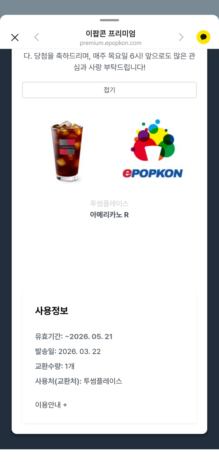투썸플레이스 아메리카노 R - 유효기간: 2026/5/21 - 가격: 4000원