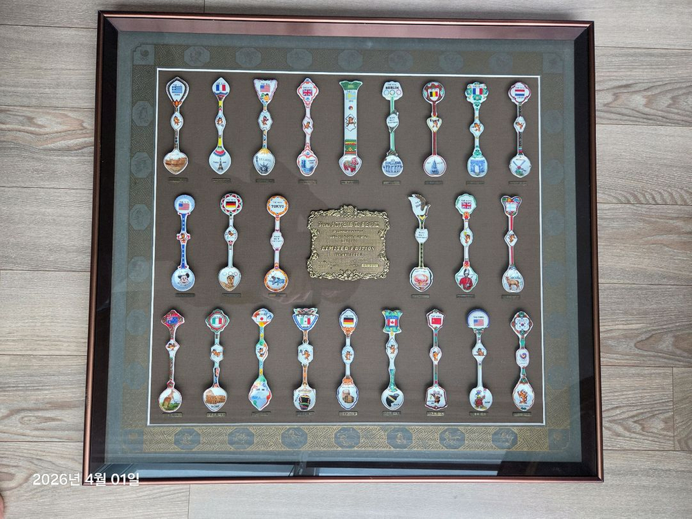 <88서울올림픽 기념 도자기 스푼액자> 88서울 올림픽을 기념하여 올림픽 개최 24개국의 도자기 스푼이 액자에 담겨있는 한정판 기념품 입니다. 당시 상당히 고가의 기념품 이었으며 현상태는 아주 깨끗합니다. 무개가 꽤 있고 파손 우려로 교대역(서울)주변에서 직거래 원합니다. 사이즈: 67*62cm, 무개: 약 7kg. 010 3742 6363