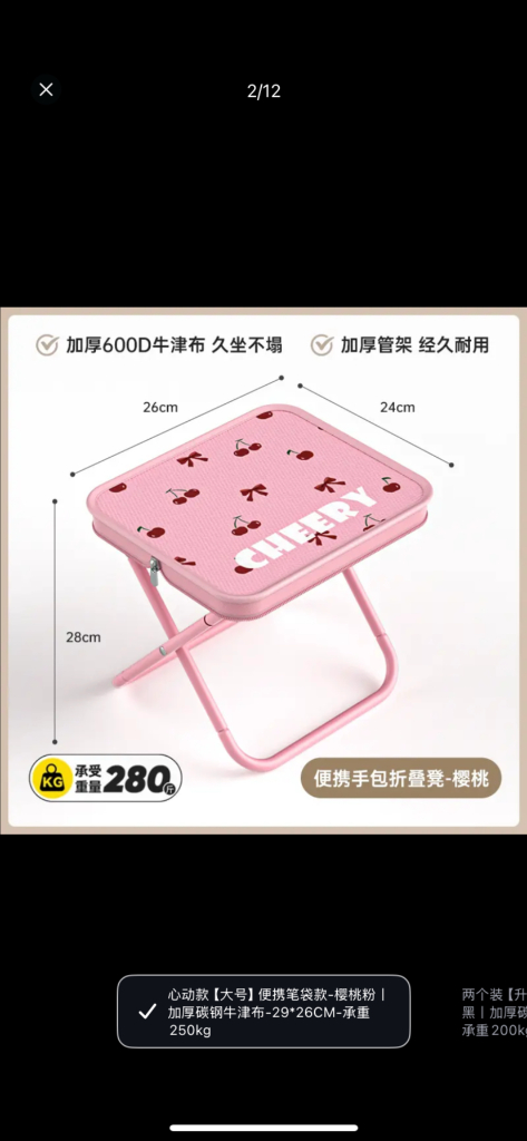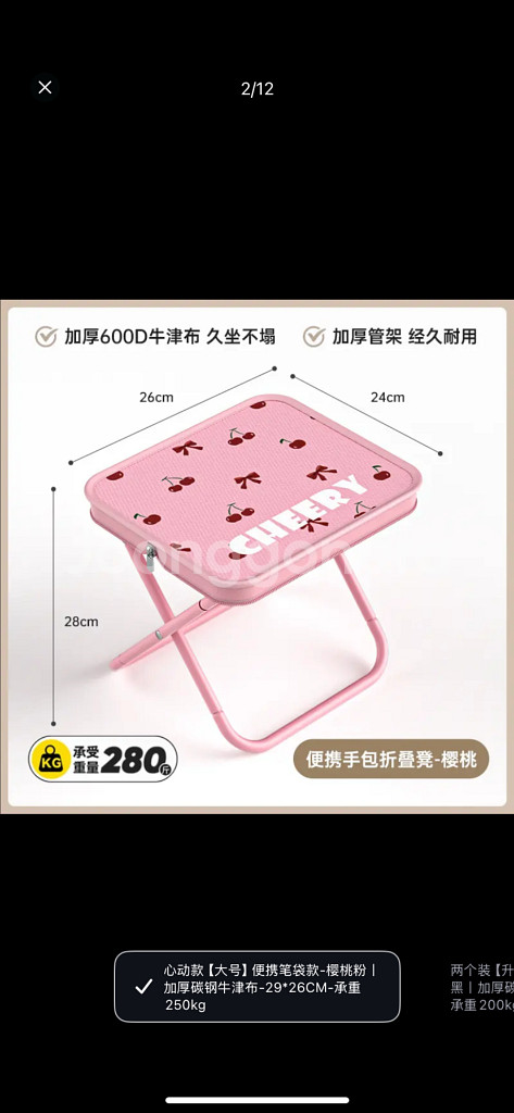 편하게 쓸 수 있는 잡의식 의자. 구매하고 나서 별로 안 썼봤음. 야외에 써본 적이 없는 거의 새 제품. 좋아하시면 편하게 톡 주세요. 첫번째 사진과 같습니다. 핑크 색깔. 튼튼해요. 반택으로 보내드립니다.(무료) 일택을 원하시면 1500원을 추가하시면 되세요.