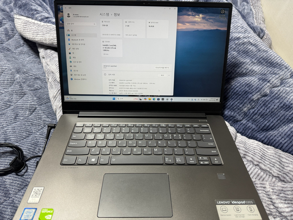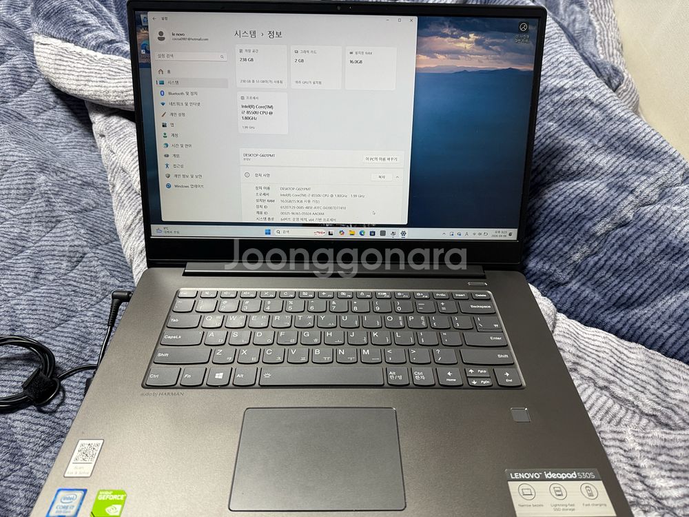 레노버 아이디어패드 530s-15ibk CPU : i7-8550U RAM : 16GB SSD : 256GB 그래픽 : GeForce MX150 포트 : HDMI, USB3.0 2개, USB-C, 헤드셋, SD카드 15인치 슬림 노트북인데 하드웨어 그래픽카드 내장되있어서 3D 게임이랑 영상편집 가능합니다. 램 16기가로 업그레이드 했습니다 고장난 곳 없고, 윈도우 초기화 해서 드립니다. 직거래선호하고 택배거래시+5000 거래후 교환, 환불X