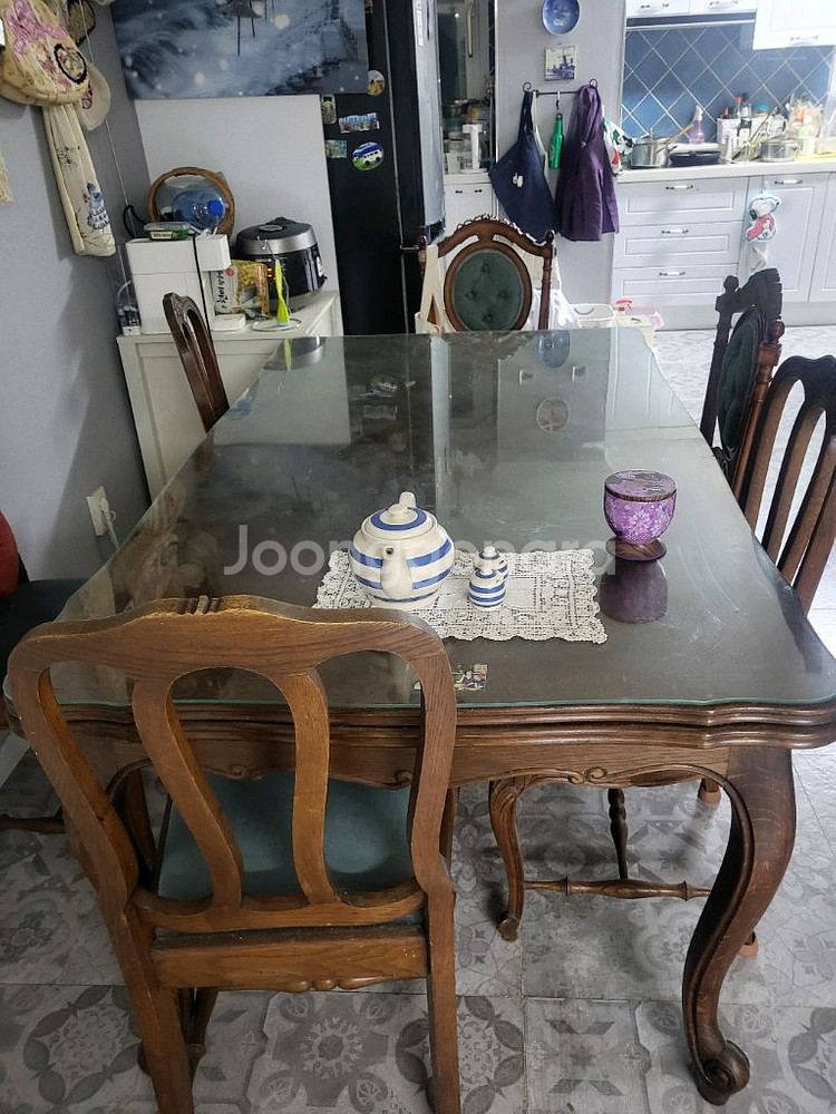 개인정보(거래정보)를 주고받는 행위는 사기에 노출될 수 있으므로 즉시 중고나라로 신고해 주세요클래식한 디자인의 프랑스앤틱 식탁과 의자 6개로 구성된 세트예요. 원목 프레임에 블루패브릭 시트가 포인트이고, 유리 상판으로 되어 있어 실용적이면서도 고급스러워요. 사용감은 있지만 전체적으로 상태 양호합니다.익스텐션기능이 있어서 더욱 넓게 사용가능합니다. 픽업은 트럭으로 가능합니다.