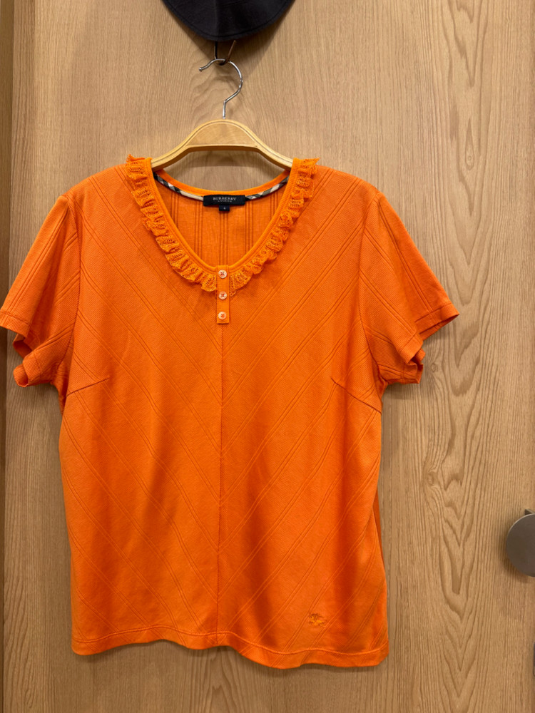 개인정보(거래정보)를 주고받는 행위는 사기에 노출될 수 있으므로 즉시 중고나라로 신고해 주세요넥 라인에 레이스 디테일이 있어 포인트 오렌지 색감의 버버리 반팔 면티셔츠 정품입니다 4사이즈(77추천)