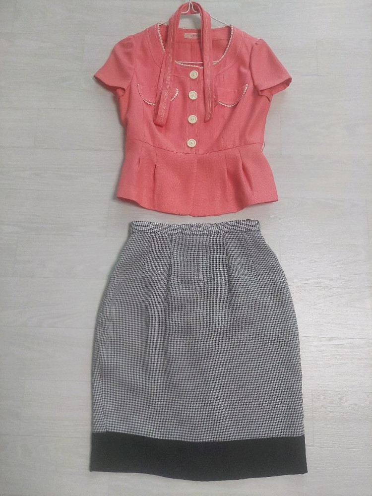 샤틴 SATIN 자켓, 치마 판매합니다. 정말 이쁜 핑크색인데 두번째 사진이 실물과 가깝습니다. 자켓은 샤틴이고 치마는 보세인데 44~55사이즈 권장합니다. 여성스럽고 단정한 스타일이라 출근룩, 모임룩, 하객룩으로 활용하기 좋은 스타일입니다. 전체적으로 깔끔한 상태입니다