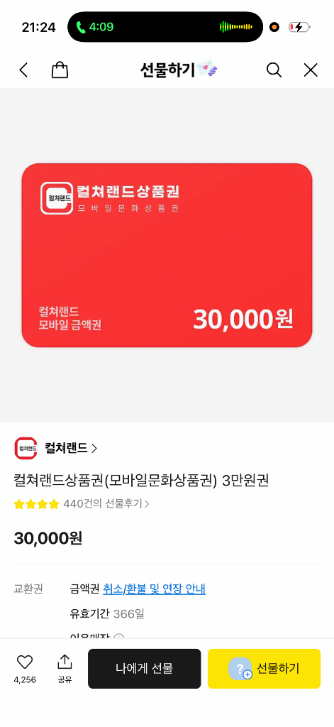 컬쳐랜드 상품권 3만원권 한장 팔아요!