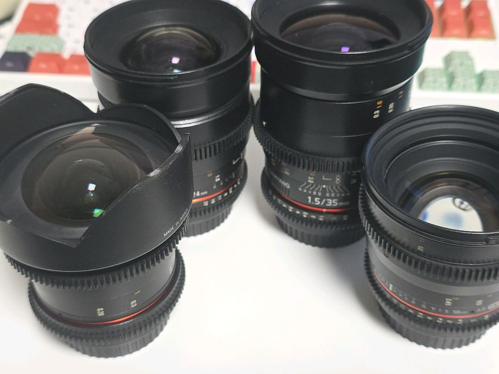 삼양 시네렌즈 vdslr 14mm t3.1, 35mm t1.5 입니다. 24mm,50mm판매완료입니다 캐논 ef 마운트입니다. 1개당 15만원 입니다. 일괄로 하시면 30->26만원 입니다. 24년에 2차 구매했고 박스는 없습니다. 사진에는 없지만 후드도 있습니다. 스크레치 없고, 떨어트리거나 박은 적 없습니다. 다만, 50mm 렌즈 조리개링 한쪽이 실제 위치보다 더 돌아가는 문제가 있습니다. 사용에는 문제 전혀 없습니다. 대구 직거래 가능합니다. 먼저 입금하시는 분과 거래하며 우체국 택배로 보내드리겠습니다. 택배거래는 파손면책, 노리턴 조건입니다. 네고문의 답장 안합니다.