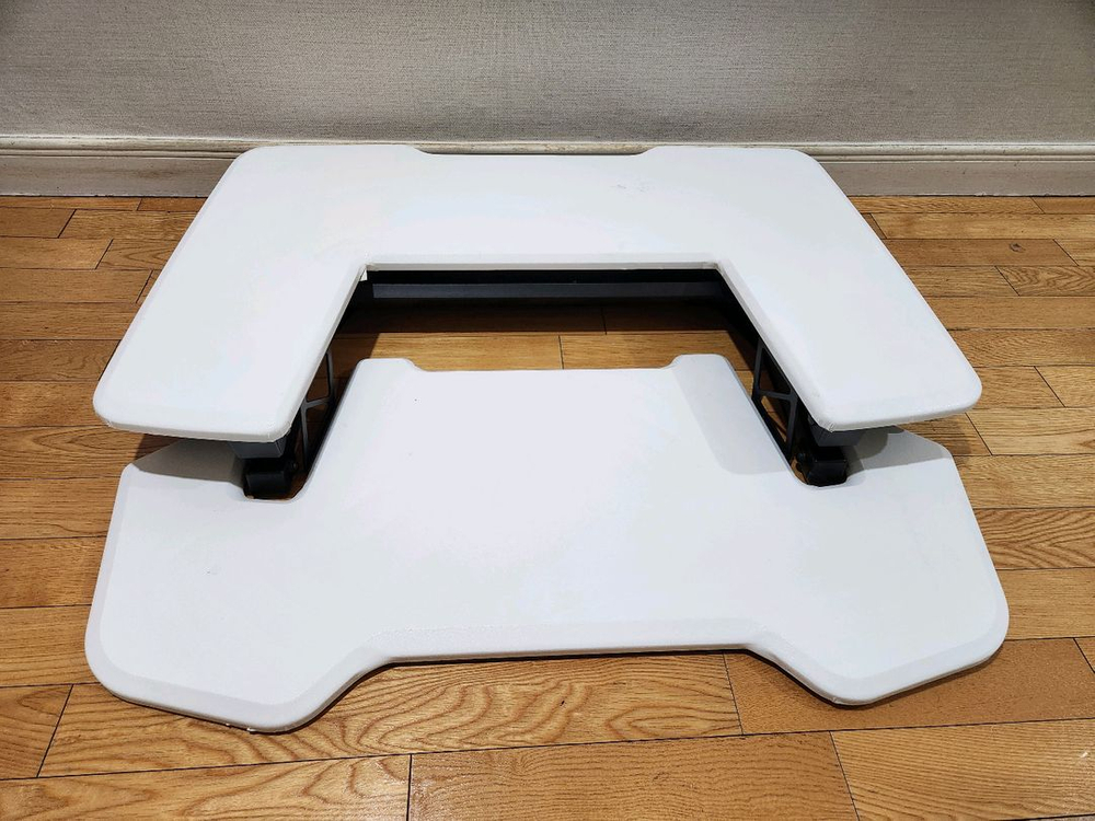 Desk Plus 브랜드의 높이 조절 스탠딩 책상입니다 상판 사이즈는 가로 900mm, 세로 800mm입니다 사용하지 않을 때는 접어서 보관할 수 있어 공간 활용에 좋습니다 책상 상판은 MDF 합판과 라미넥스로 제작되었습니다 높이 조절이 가능하여 앉아서 또는 서서 작업할 수 있습니다 제품명: 책상 제조년월: 2016년 10월 외형치수: 900x800(S) 원래 블랙 색상인데 제가 시트지를 붙였습니다 양쪽 손잡이를 잡고 위로 올리면 됩니다 전동이 아니라서 간단히 조작이 되서 편하기도 합니다 견고하고 튼튼합니다 직거래만 가능합니다 주소는 경기도 성남시 분당구 입니다 혹시 가까우면 1만원 받고 가져다 드릴 수 있습니다