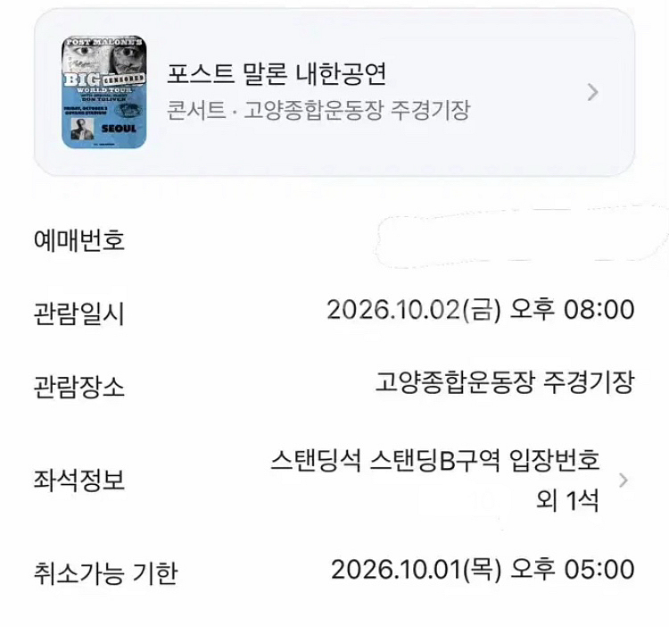 포스트말론 내한공연 콘서트 스탠딩B 100번대 2연석
