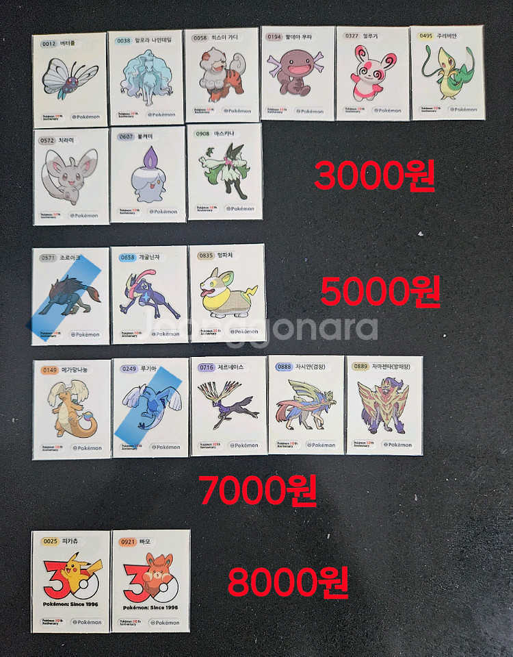개인정보(거래정보)를 주고받는 행위는 사기에 노출될 수 있으므로 즉시 중고나라로 신고해 주세요포켓몬 시즌5 개봉후 바로 opp보관중입니다. 사진에 금액 적혀있어요. 파란색 체크표시는 품절입니다 3장 이상 판매해요~