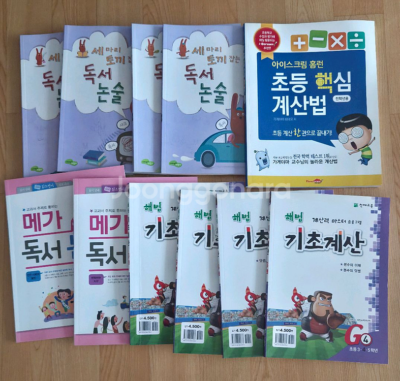 초등 논술, 수학문제집들 몽땅 10,000원 9번째 사진 노트등은 덤입니다 1. 세마리 토끼잡는 독서논술 C2, C3, C4, C5 (4권) 정가9,500씩 - 새책 2. 메가독서논술 B4, B5 (2권) 정가 9,500원씩 - 새책 3. 기초계산 G3, G4, G5, G6 (4권) 정가 4,500원씩 - 기초계산 G5만 45페이지까지 문제풀이함 나머지는 새책 4. 초등핵심계산법 전학년용 - 새책 반품 정중히 거절합니다