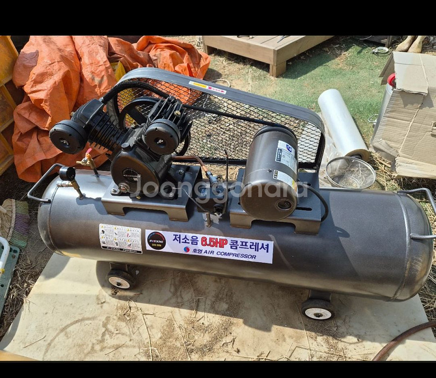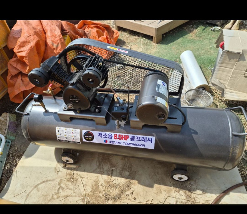 개인정보(거래정보)를 주고받는 행위는 사기에 노출될 수 있으므로 즉시 중고나라로 신고해 주세요HOYOUNG 6.5HP 에어 컴프레서 HV-65L 모델입니다 2022년 10월에 제조되었고, EJ SUPER POWER induction motor가 장착되어 있습니다