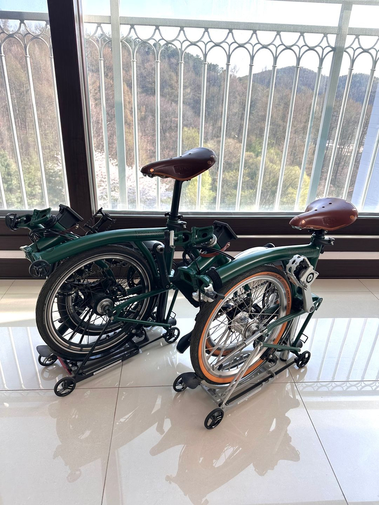 브롬톤 C라인 M6R 레이싱그린 2대 판매합니다.(22년식 1대 / 23년식 1대) 두 제품 모두 23년에 구입한 산바다스포츠 정식제품이며 23년식은 bb5 이스트점에서 1차 순정구매, 22년식은 중고 2차 순정구매 후 벨로하우스 송파점에서 드레스업 했습니다. 두 대 모두 단순 순정 상태가 아니라 브룩스 가죽 안장, 그립, 리어랙, 타이어, 램프, 싯포스트 등 각각 약 100만원 이상 커스텀된 완성형 브롬톤입니다. 22년식은 저희 와이프가 23년식은 남편인 제가 탔으며 남성인 제가 키가 있어서 연장 싯포스트 설치하여 탔습니다. 출퇴근, 라이딩, 여행까지 바로 가능한 세팅이라 추가 튜닝 없이 바로 타시면 되고 구매후 짧은 거리 3번 정도 주행했으며 사진과 같이 실내에서 보관만 했던 제품입니다 레이싱그린 + 브룩스 조합 감성 세팅 리어랙 및 이동 편의 세팅 완료 실내 보관 / 상태 매우 양호합니다 1대당 각각 240만원에 판매하며 일괄은 480만 판매합니다 사진 추가 요청 및 문의 편하게 주세요.