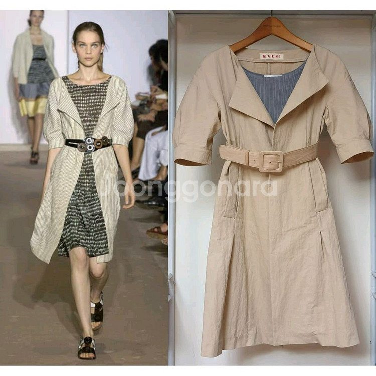 자연스럽고 미세한 구김 가공을 더한 고시감 있는 면나일론 혼방 원단으로 만들어져 실용성과 스타일까지 잡을 수 있는 원피스 스타일의 코트 자켓입니다. 사실상 겨울 빼고는 3계절 내내 활용이 가능해서 정말 잘 입어지실 거에요. 전용 벨트가 함께 구성되어 있으며 양 옆구리 슬릿에 끼워서 연출하면 되는데 벨트가 다소 뻣뻣하고 딱딱한 편이라 벨트 없이 오픈해서 입으시거나 가지고 계신 다른 벨트를 사용하셔도 좋아요. 패션쇼 사진에서 보듯이 모델들도 각기 다른 벨트로 스타일링했거나 벨트 안하고 오픈해서 연출했음을 알 수 있습니다. 사이즈 42(M) 하이웨이스트라 55반~날씬 66 권장드리며 가슴이나 흉통이 큰 체형은 벨트 없이 오픈해서 입으시면 편하세요. 미착용이고 벨트 뒷면 본드 접착 부위에 경년에 의한 자연스러운 반응 흔적있으나 하자가 아니며 착용시 보이지 않아 전혀 문제 없습니다. 되도록 마르니 좋아하시거나 안목있는 분께서 구입하시면 좋겠습니다.