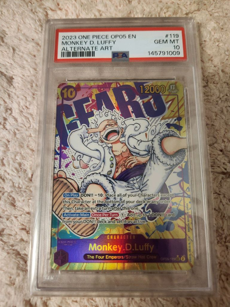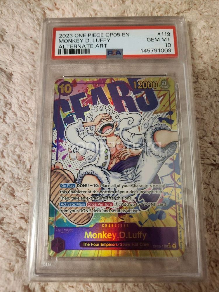 원피스 카드 루피 얼터네이트 레어 영어판 카드입니다. PSA 10 획득한 카드이며 상태좋습니다. 수수료 없는 거래는 별도 문의주세요. 문의 없으시면 안심결제 해주시면 됩니다!