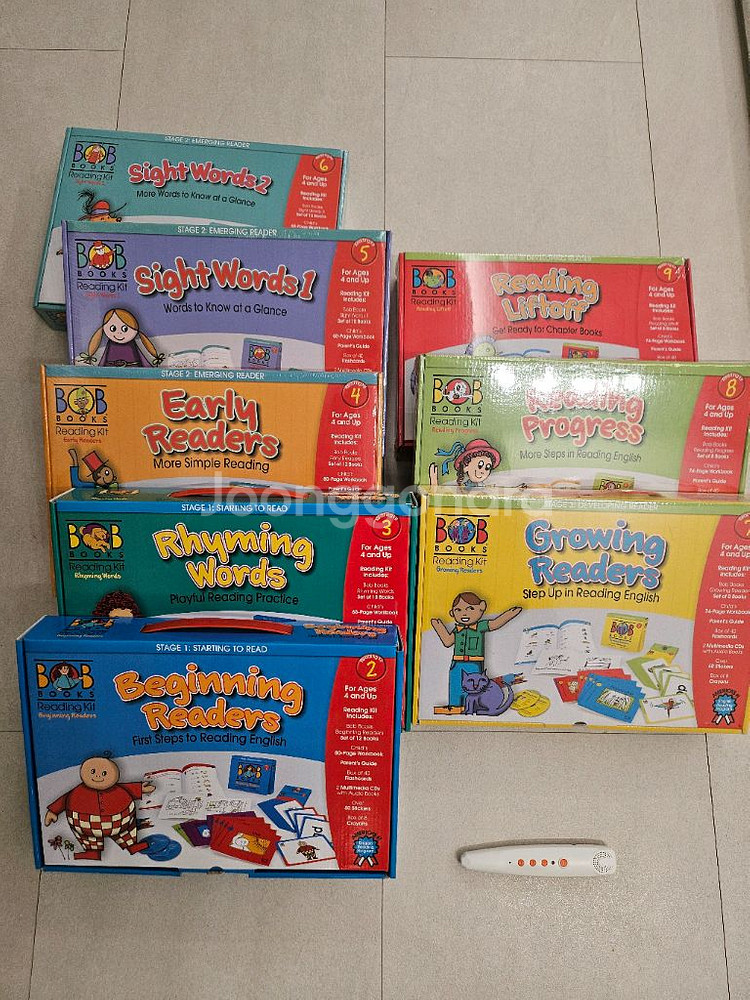 Bob Books 리딩 키트 세트입니다. 아이들의 영어 읽기 능력 향상을 도와주는 단계별 학습 교재로 구성되어 있어요 스테이지1은 알파벳 배우는 단계라 구매를 안했습니다. 2, 3 키트 개봉 2키트 개봉했지만 새상품 수준 3키트 책 5권 분실 4~9키트 미개봉 리딩펜 포함 구성입니다. 파닉스 엄마표로 하기에 너무도 좋은 키트인데 게으름으로 해주질 못했네요. 너무 쉽고 재미있어서 흥미끌기에도 좋아요 페어런트가이드가 있어 가르치는 방법 익혀서 제대로 가르쳐줄 수 있어요. 리딩펜으로 원어민 발음 똑같이 구현 가능합니다. - Stage 1: Starting to Read (Beginning Readers, Rhyming Words) - Stage 2: Emerging Reader (Sight Words 1, Early Readers) - Stage 3: Reading with Help (Rhyming Words) - Stage 4: Reading Independently (Sight Words 2) - Stage 5: Reading with Confidence (Reading Progress) - Stage 6: Reading Fluency (Reading Letters) - Stage 7: Growing Readers - Stage 8: Reading Progress - Stage 9: Reading Liftoff 각 단계별로 다양한 읽기 자료와 활동이 포함되어 있어 아이들이 즐겁게 영어를 배울 수 있습니다 포함된 구성품으로는 책, 플래시카드, 멀티미디어 CD, 스티커, 크레용 등이 있습니다 함께 제공되는 리딩펜으로 책을 읽어주면 아이들이 더욱 흥미를 느낄 수 있어요