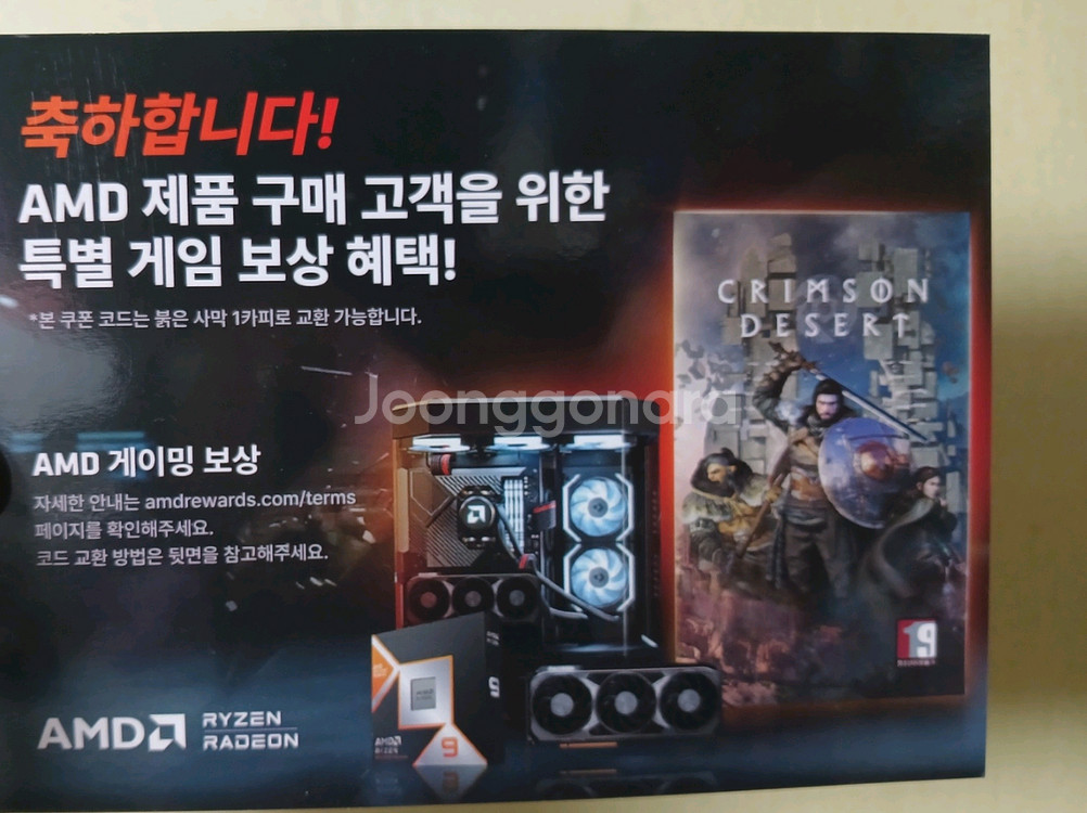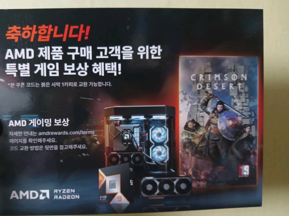 AMD 붉은사막 게임 코드 판매합니다 AMD CPU 구매 시 제공된 코드입니다 Steam 게임으로 교환 가능 *교환 방법 AMD Rewards 사이트 접속 Ryzen 9800X3D 이상 CPU 장착 후 인증 인증 완료 후 Steam에서 게임 등록 *안내 및 주의사항 대리 인증 불가 (구매자 직접 인증 필요) 코드 특성상 노출 후 환불 불가 *거래 방식 온라인 거래 가능 입금 확인 후 긁어서 코드 전송