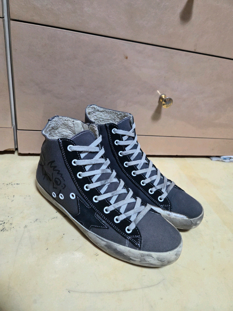골든구스 스니커즈 남성용입니다 원산지ㅡ이탈리아수입 100% 오리지널 정품 정규 매장 판매용 확실한 정품으로 정품 아니거나 하자 조금이라도 있으면 200%배상하고 바로 반품받습니다 ㆍ연락처 01087600595 색상ㅡ 다크 그레이/ 블랙 소재ㅡCALF.송아지 가죽 41사이즈로 한국인 사이즈는 남성 260~265입니다 높이는 미들탑 또는 하이탑 정도이며 높이는 12센티입니다 가장 보편적인 디자인으로 가장 많이 팔리는 스테디 모델입니다 지퍼가 있어서 착용하기에 편리합니다 컨디션은 사진에 보이는 그대로 거의 새제품에 준하며 어느곳도 하자나 흠집같은것 전혀없이 완전 깨끗합니다 기스도 전혀없고 밑바닥도 사진과 같이 거의 닳지 않았습니다 완전 깨끗하니 세탁할 필요없이 그대로 착용하시면 되고 형태도 새거 그대로 완전 반듯합니다 사진상 그대로입니다 낙서(PAOLO)는 원래 제작시에 인쇄되어 나온 컨셉입니다, 옆면 사진 참조 택배비포함 110000원입니다 단품으로 직거래 가능합니다 도봉구 쌍문3동 전철은 쌍문역 차로 오시면 한일병원 입구가 좋습니다 익일도착 우체국 등기 특송하고 송장도 찍어 보내 드립니다 군데 군데 흠처럼 보이는 부분은 원래 빈티지 컨셉인지는 다 아실것입니다