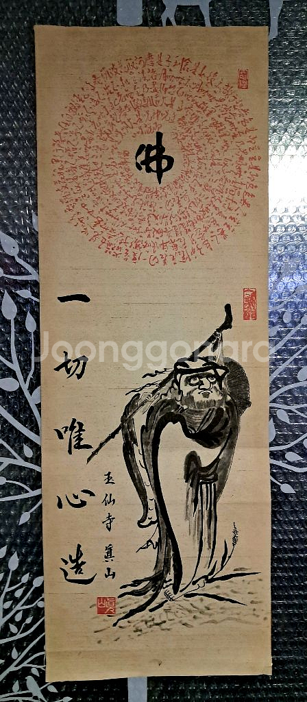 섬세한 필치로 그려진 달마도 판매합니다. 붉은 글씨로 가득 채워진 상단부와 달마대사의 조화가 인상적입니다. 집안에 걸어두면 좋은 기운이 솟아날 것 같아요. 문의 없으시면 바로 안전결제해주시면 됩니다! 영인본 입니다 가로 24.5cm 세로 70cm