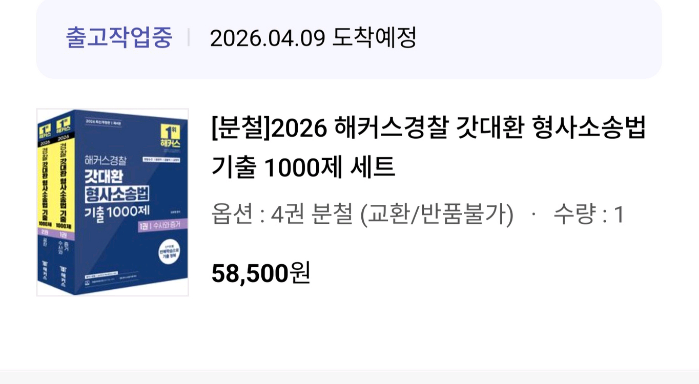 개인정보(거래정보)를 주고받는 행위는 사기에 노출될 수 있으므로 즉시 중고나라로 신고해 주세요2026년 해커스경찰 강대한 형사소송법 기출문제집 세트입니다. 이미 있는 상품인데, 실수로 잘못구매해서 급하게 내놓습니다 배송은 내일 올 예정이며... 분철로 주문하여 취소가 린되어 싸게 내놓습니다.