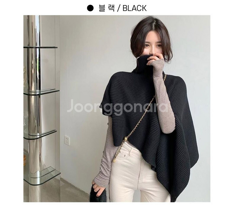 블랙 니트 케이프예요. 목 부분이 높고 어깨가 넓어서 스타일리시하게 연출할 수 있어요. 상태 양호하고 가을겨울 데일리룩에 완벽해요!