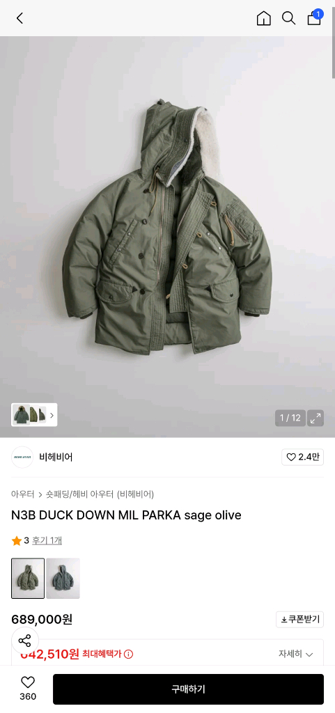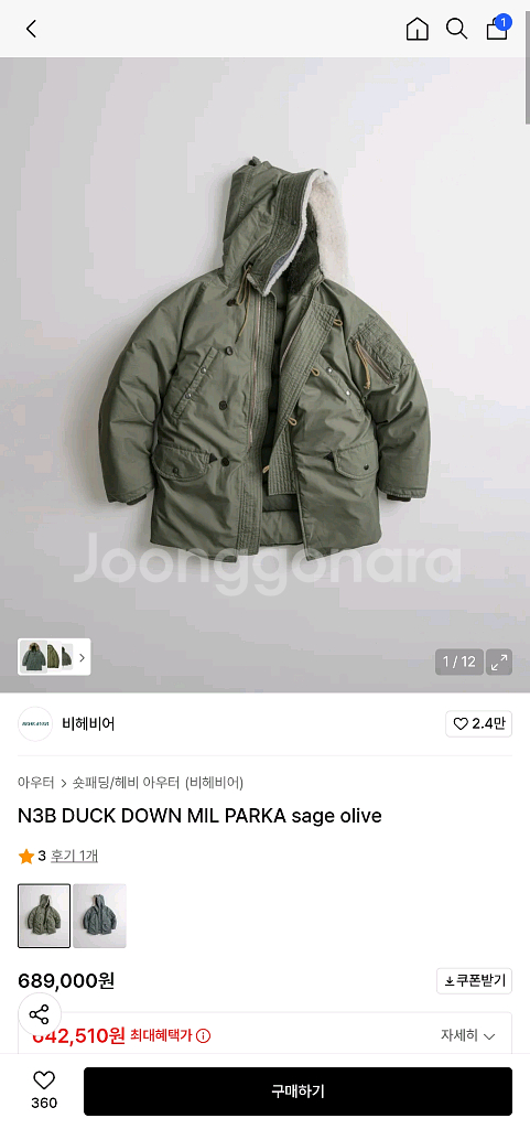 개인정보(거래정보)를 주고받는 행위는 사기에 노출될 수 있으므로 즉시 중고나라로 신고해 주세요24fw 비헤비어 N3B 덕다운 패딩 밀 파카 세이지올리브 사이즈 3 라지 105-108 상세 사이즈 참조바랍니다. 사이즈 확인차 착용후 택 제거. 실착용 외출 없습니다. 안전결제 부탁드립니다.