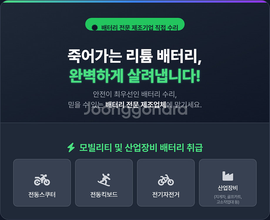 죽어가는 리튬 배터리, 완벽하게 살려냅니다! 안전이 최우선인 배터리 수리, 믿을 수 있는 배터리 전문 제조업체에 맡기세요. 모빌리티 및 산업장비 배터리 취급 전체 점검 및 수리 원인 모를 방전 및 전원 꺼짐 증상 완벽 진단 배터리 셀 밸런스 정밀 조정 틀어진 밸런스를 맞춰 주행거리 및 출력 회복 배터리 부분 / 전량 교체 (리필) 불량 셀만 찾아 부분교체 하거나 새 셀로 전량 리필 용량 업그레이드 & 맞춤 제작 더 멀리, 더 강력하게! 고객 맞춤형 배터리 팩 제작 배터리 입고 후 진행 절차 1. 정밀 점검 및 테스트 전문 장비를 이용해 전압, 저항, 셀 밸런스 등 배터리 현재 상태를 정확하게 진단합니다. 2. 투명한 솔루션 협의 과잉 정비는 NO! 밸런스 조정, 부분교체, 전량교체 등 가성비와 안전을 고려한 최적의 솔루션을 제안합니다. 3. 전문 유지보수 진행 검증된 고품질 정품 셀과 안전한 부자재만을 사용하여 제조사 기술력으로 완벽하게 수리합니다. 4. 수령 및 안전 발송 수리 완료 후 테스트 영상을 제공해 드리며, 직접 방문 수령(김포) 또는 꼼꼼한 포장 후 택배 발송해 드립니다. 믿을 수 있는 배터리 전문 기업 (경기 김포 소재) 빠른 상담 및 견적 문의 중고나라 1:1 채팅 환영! "기종과 증상을 먼저 알려주시면 빠른 상담이 가능합니다."