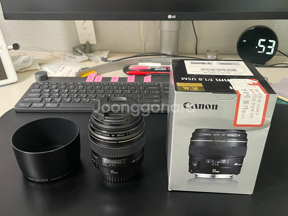 캐논 EF 85mm f1.8 USM 렌즈 중고 구매 후 제습함에만 보관하다가 판매합니다. 렌즈, 렌즈 앞뒤 커버, 박스, 캐논 UV 필터, 정품 후드, 제품 보증서 포함 입니다. 추가로 구매한 호루스벤누 렌즈 파우치도 같이 드리겠습니다. 택배로만 판매합니다. 같이 판매하고 있는 캐논 제품 2개 이상 구매하시면 택배비 무료로 배송해 드리겠습니다. 검색 바랍니다.