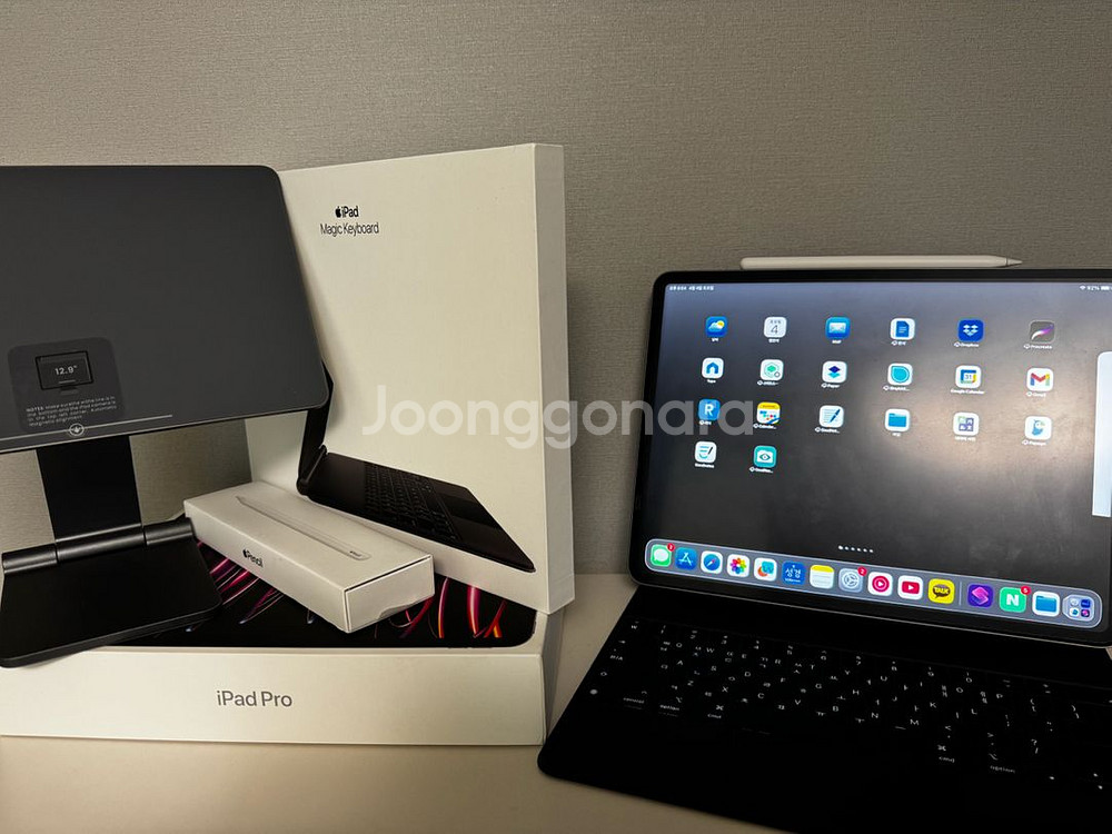 아이패드 프로 12.9 6세대 128GB 판매합니다. 외관 상태 정말 좋고, 찍힘이나 큰 기스 없이 깔끔하게 사용했습니다. 작년에 애플 리퍼 받은 제품이고, 현재 배터리 효율 94% 확인됩니다. 기기 상태 민감하신 분도 만족하실 만한 편입니다. 구성품 1. 아이패드 프로 12.9 6세대 128GB 2. 정품 키보드케이스 3. 애플펜슬 4. Rhinofit 케이스 5. 니케 아이패드 마그네틱 거치대(드로잉용) 6. 지니비 나노흡착 종이질감 필름 필기, 드로잉, 영상시청, 문서작업 바로 가능한 구성입니다.(특히 드로잉 추천) 추가로 구매할 것 거의 없이 바로 사용 가능합니다. 유상리퍼로 교화한만큼 상태 좋고, 실사용 문제 전혀 없습니다. 직거래 선호하고, 상태 좋은 매물 찾으시는 분 연락 주세요. 판매가 급하지 않아서, 네고는 정중히 사양합니다.