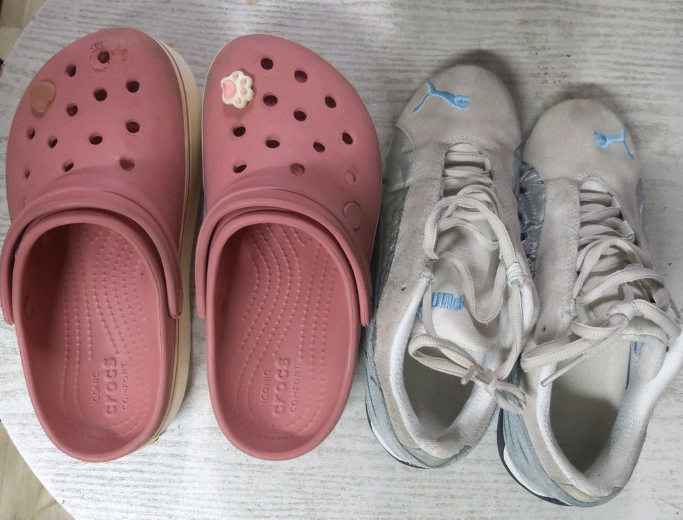 크록스 & 퓨마 신발 (220~230) 팝니다. 크록스는 볼이 넓고 굽이 있고 사용감 있습니다 (사진참조). 퓨마는 볼이 넓지 않고 굽이 없고 사용감 거의 없습니다 (사진참조). 신발 사이즈는 220~230정도라 오셔서 신어 보시고 결정하세요 둘 다 가격은 22,000원입니다. 직거래는 동신아파트 (장안로232) 101동에서 합니다. 관심 있으신 분은 톡이나 010-7797-2374로 문자 주세요.