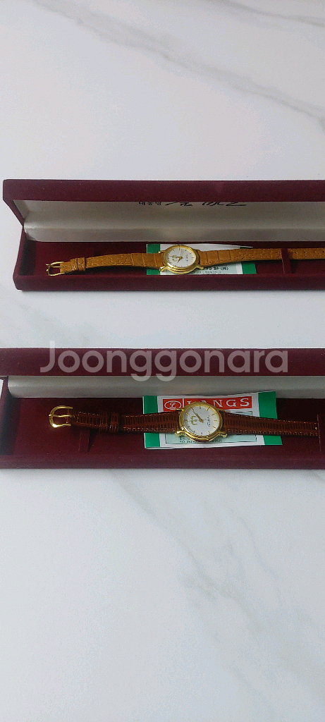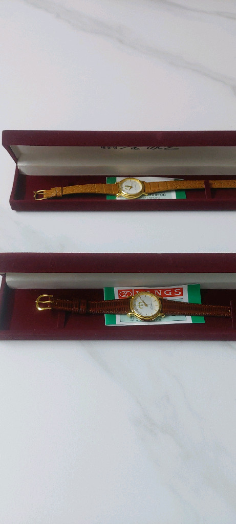 개인정보(거래정보)를 주고받는 행위는 사기에 노출될 수 있으므로 즉시 중고나라로 신고해 주세요김영삼대통령 기념 여성 손목시계 2개 판매합니다. 외관, 색상은 사진 참고하세요.. (시계둘 색상은 밝은갈색과 짙은갈색 입니다) 미사용 제품이며 사용시 시계건전지는 넣으셔야 될듯 합니다. 케이스와 보증서 있어요.