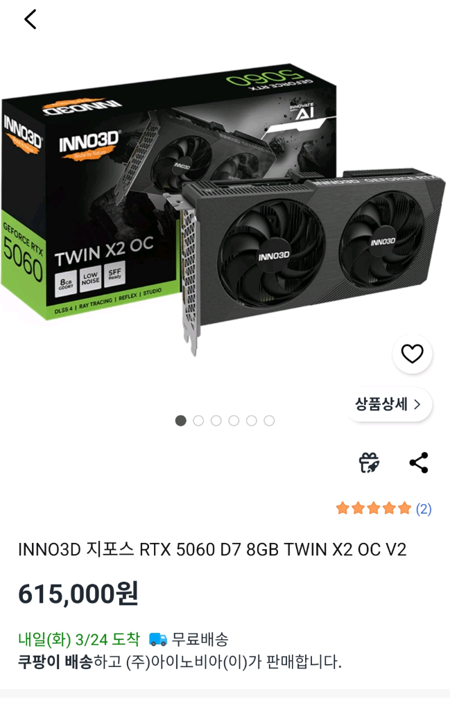 개인정보(거래정보)를 주고받는 행위는 사기에 노출될 수 있으므로 즉시 중고나라로 신고해 주세요INNO3D GeForce RTX 5060 Twin X2 OC V2 8GB GDDR7 그래픽 카드 새제품입니다