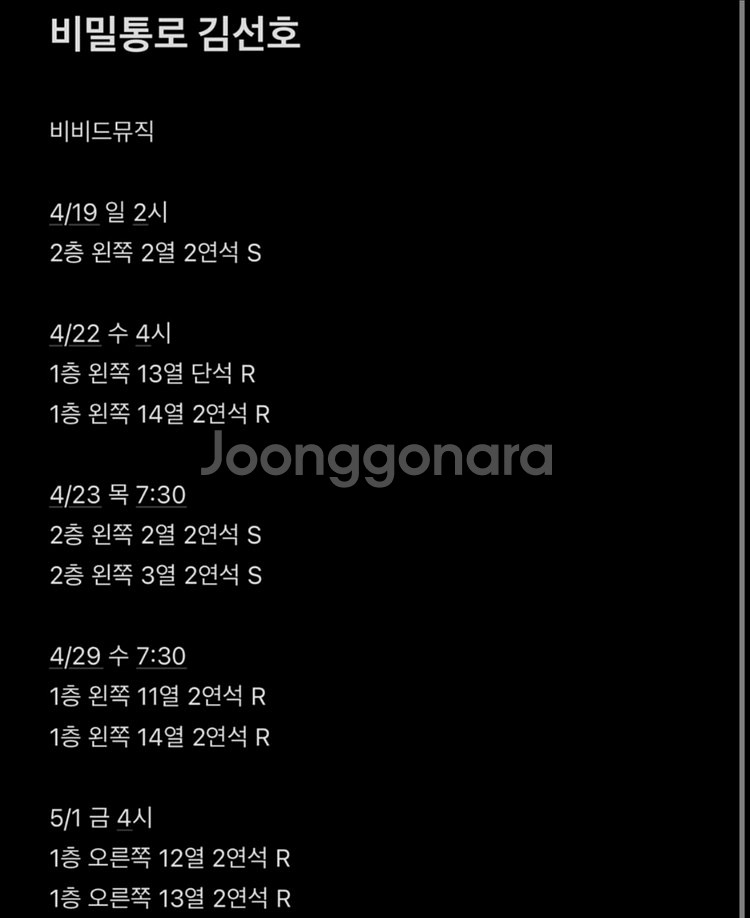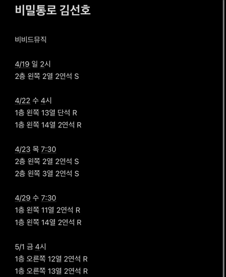 4/19 일 2시 2층 왼쪽 2열 2연석 S 4/22 수 4시 1층 왼쪽 13열 단석 R 1층 왼쪽 14열 2연석 R 4/23 목 7:30 2층 왼쪽 2열 2연석 S 2층 왼쪽 3열 2연석 S 4/29 수 7:30 1층 왼쪽 11열 2연석 R 1층 왼쪽 14열 2연석 R 5/1 금 4시 1층 오른쪽 12열 2연석 R 1층 오른쪽 13열 단석 R